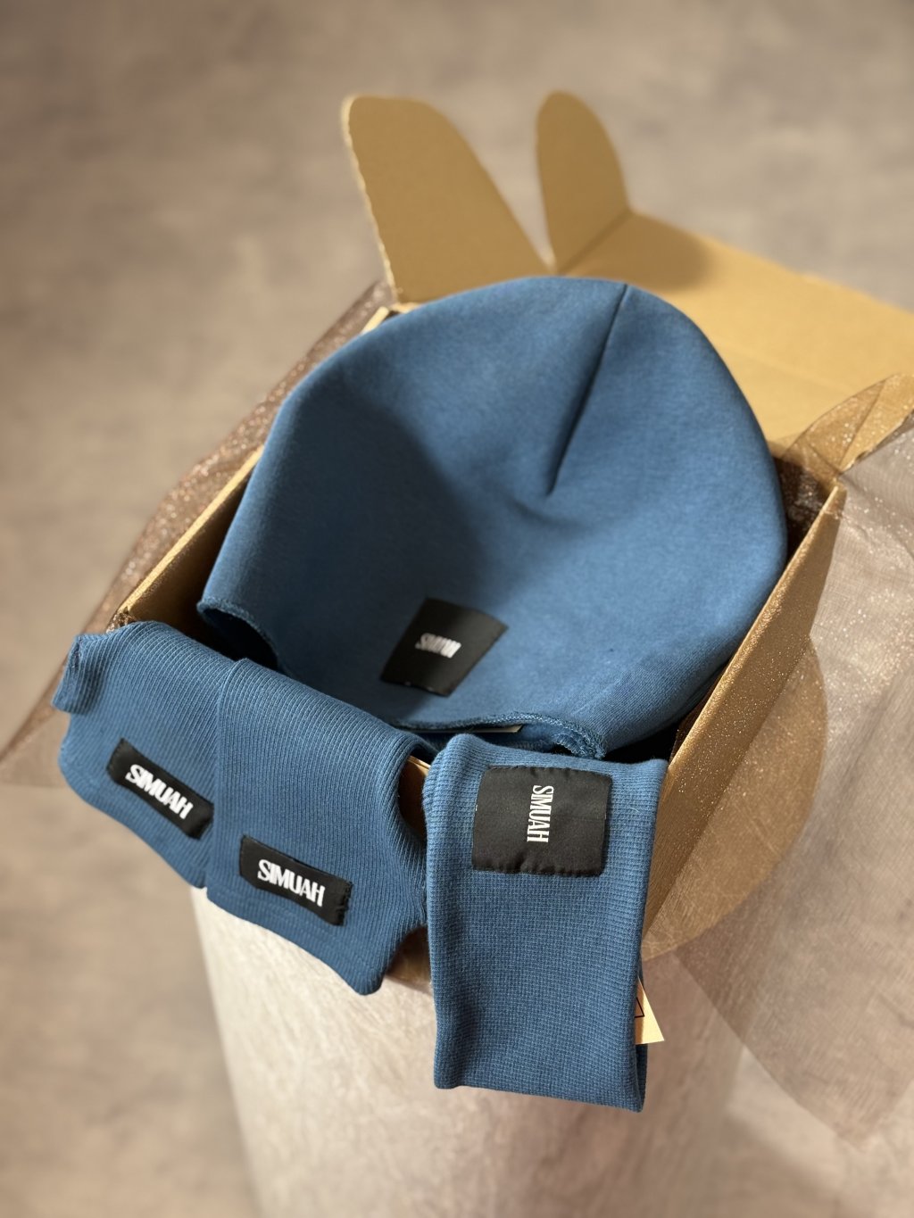 Obsahuje 3 obrandované produkty naší značky SIMUAH a to čepici, návleky na ruku a čelenku.