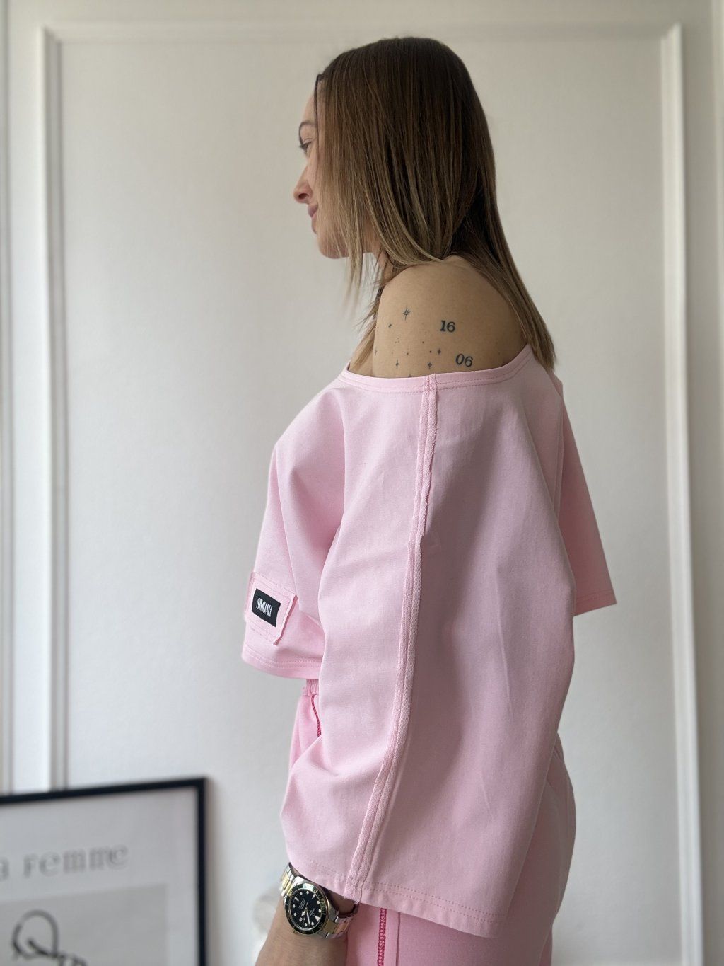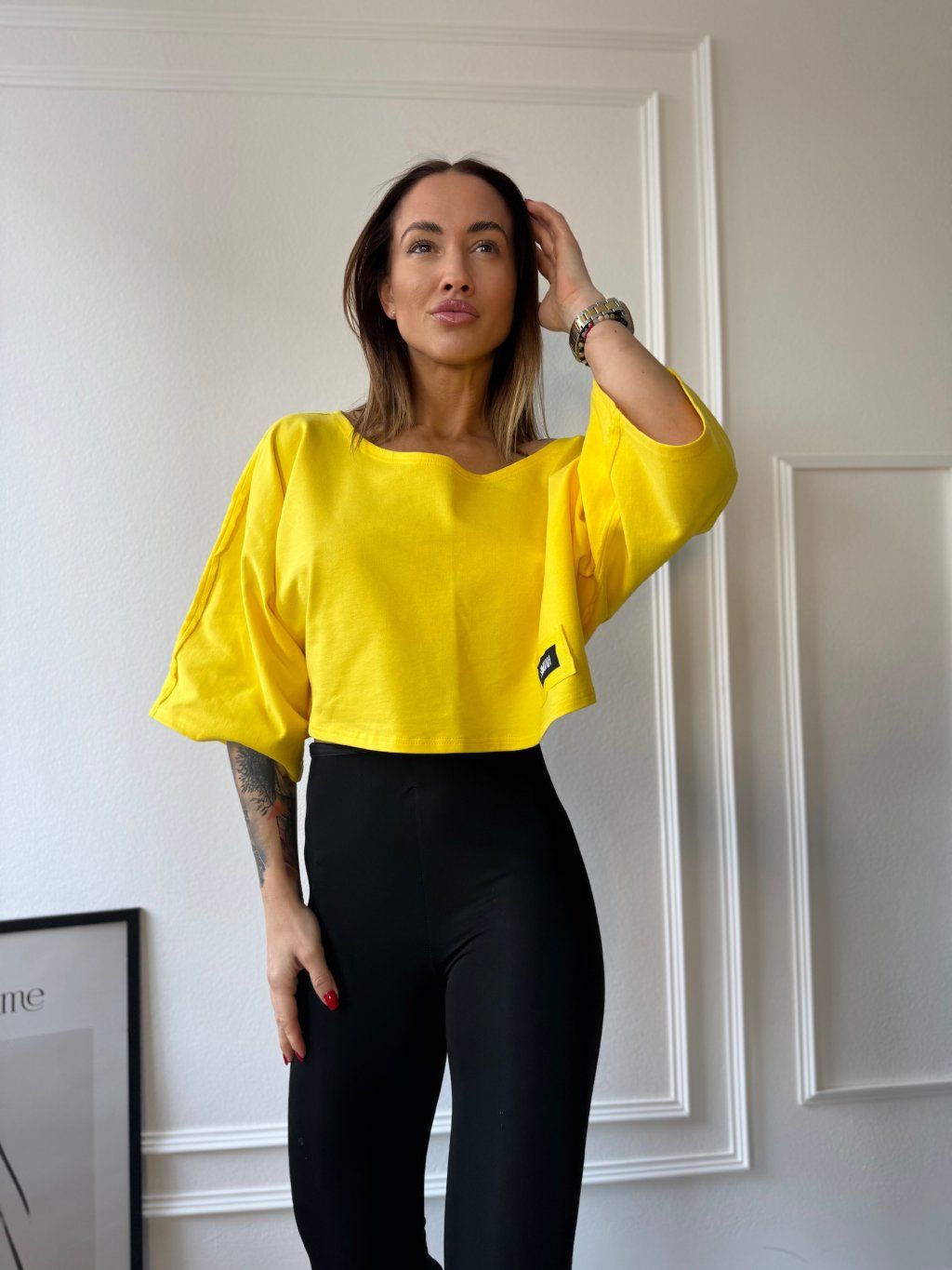 Tričko má oversize strih a jemne cropnutú dĺžku, vďaka čomu vytvára dokonalú siluetu. Skvele sa hodí najmä k legínam alebo džínsom.