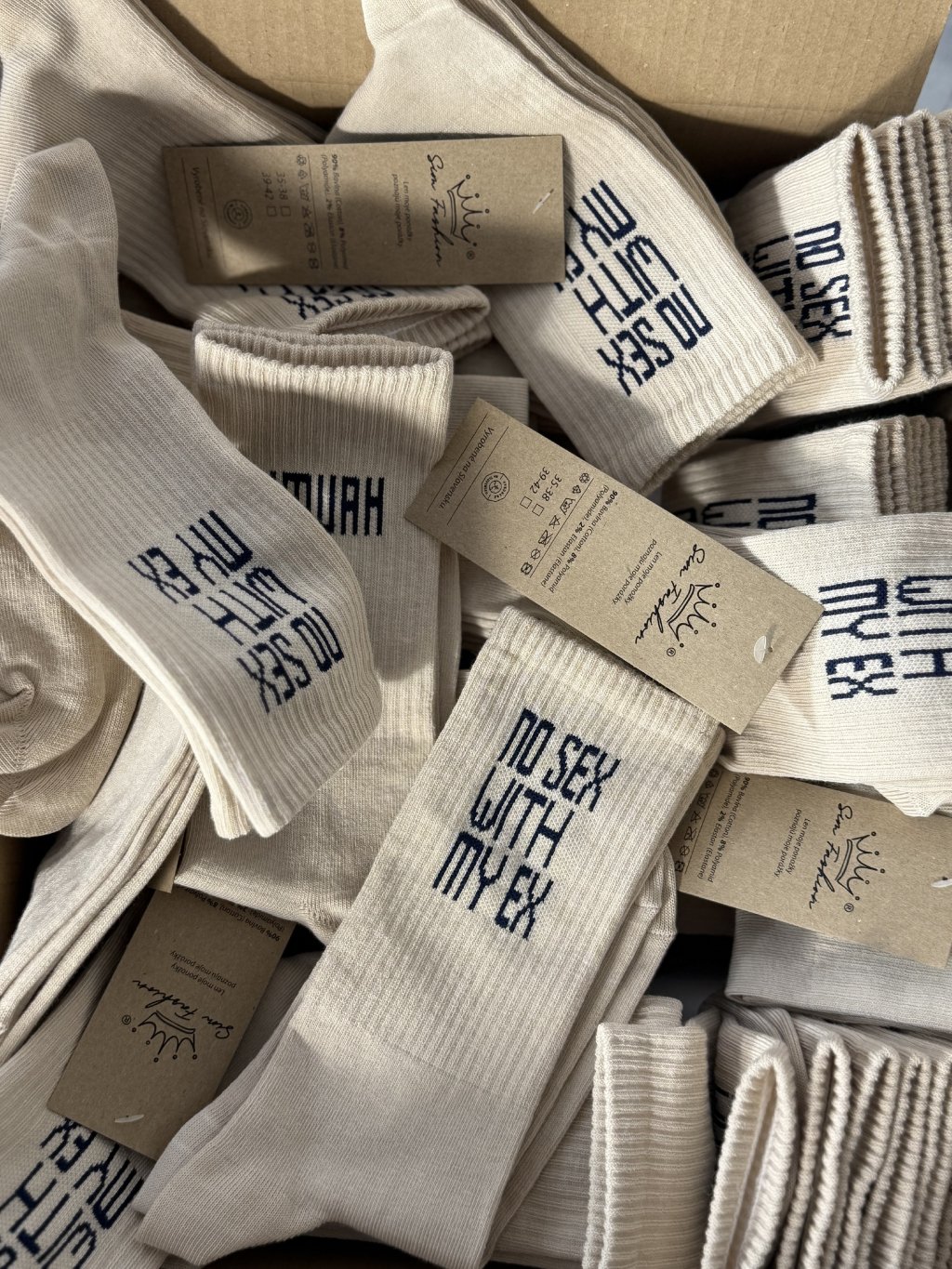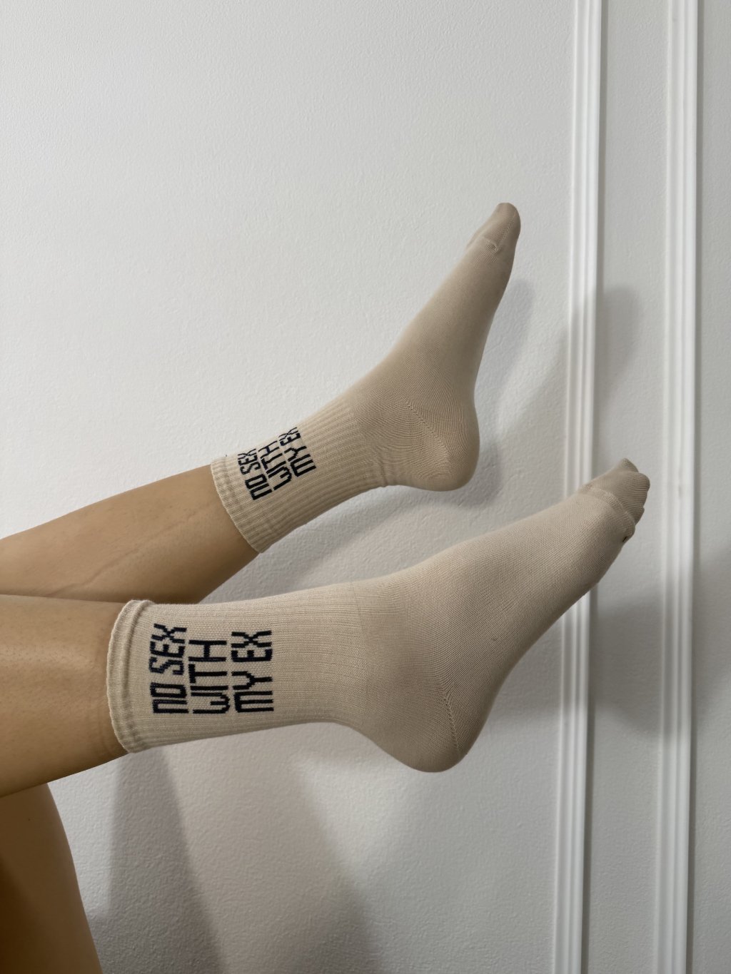 Štýlové vysoké ponožky s nápisom NO SEX WITH MY EX. Ponožky dýchajú,držia tvar a zaručujú maximálne pohodlie. Perfektné k teniskám aj k metskému outfitu-jednoduchý detail ktorý ťa odlíši.